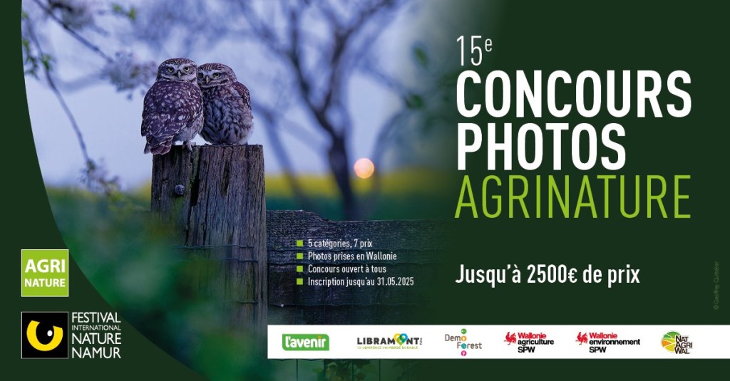 2 de mes images sont sélectionnées au Concours Photos Agrinature organisé par le Festival International Nature Namur : la 1ère, « Coco en Balade », dans la catégorie *Les Invisibles* et la seconde « Tableau de Brame », dans la Catégorie *Wallonie Sauvage* L’expo des finalistes sera présentée au public à la Foire de Libramont du 25 au 28 juillet Proclamation des résultats le dimanche 27 juillet à 14h30.Ensuite, l’expo des finalistes prendra la direction de la Foire Agricole de Battice les 6 et 7 septembre avant de prendre place au Festival International Nature Namur du 11 au 19 octobre.